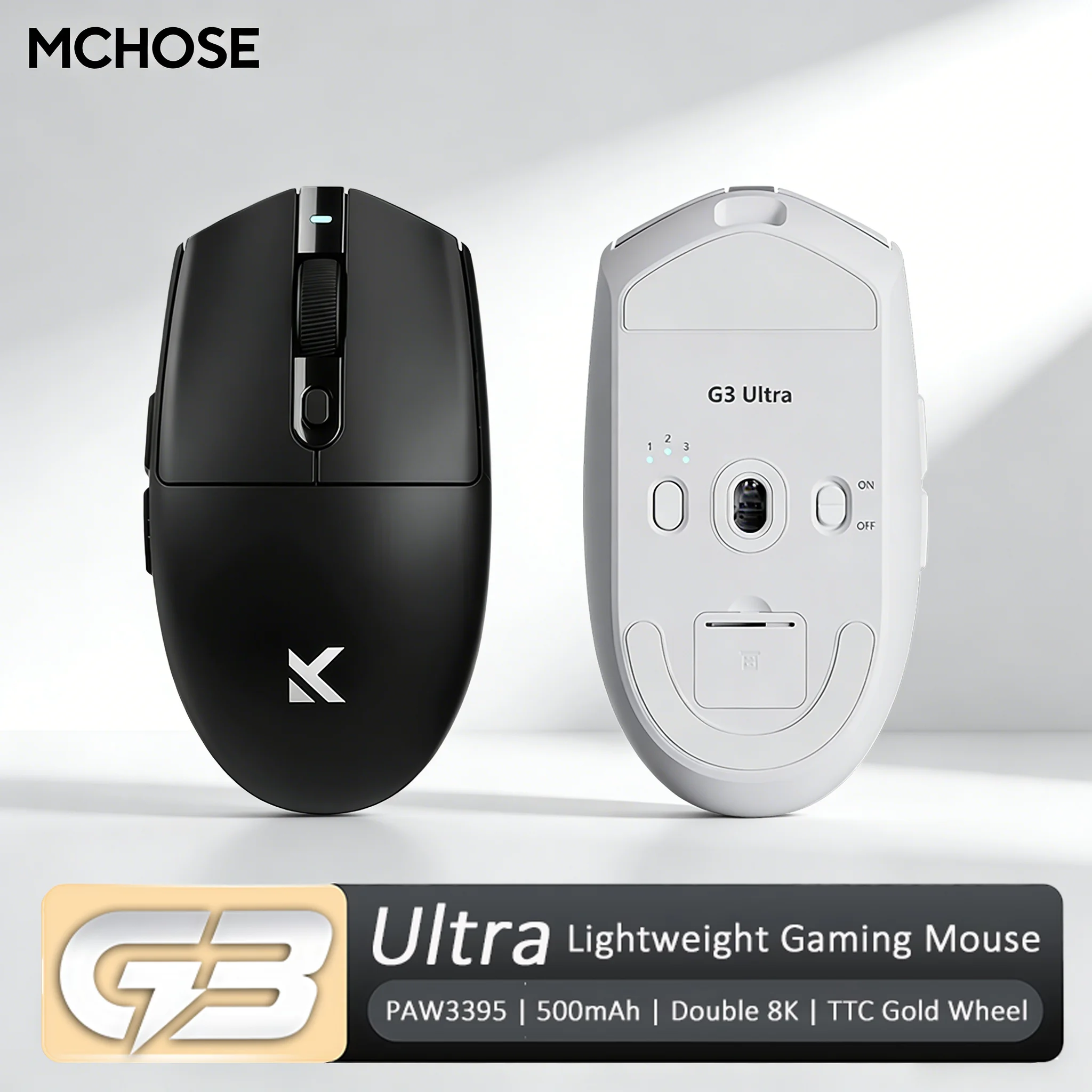 MCHOSE G3 Ultra Wireless Mouse Double 8K PAW3395 Tri-Mode Ultra-Lightweight Office Gaming Mouse TTC Gold Wheel OMRON Switches